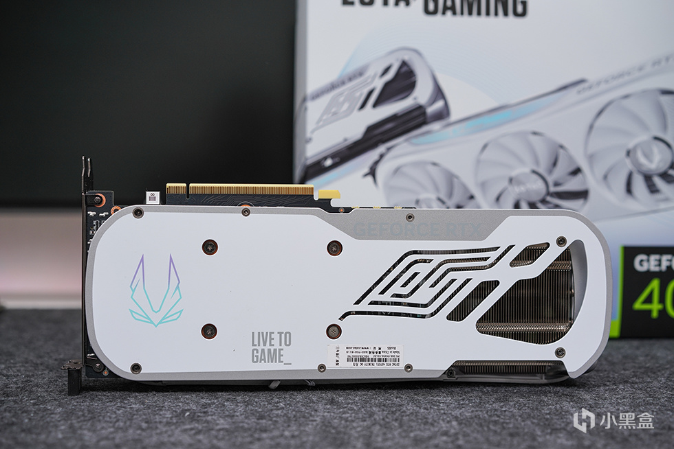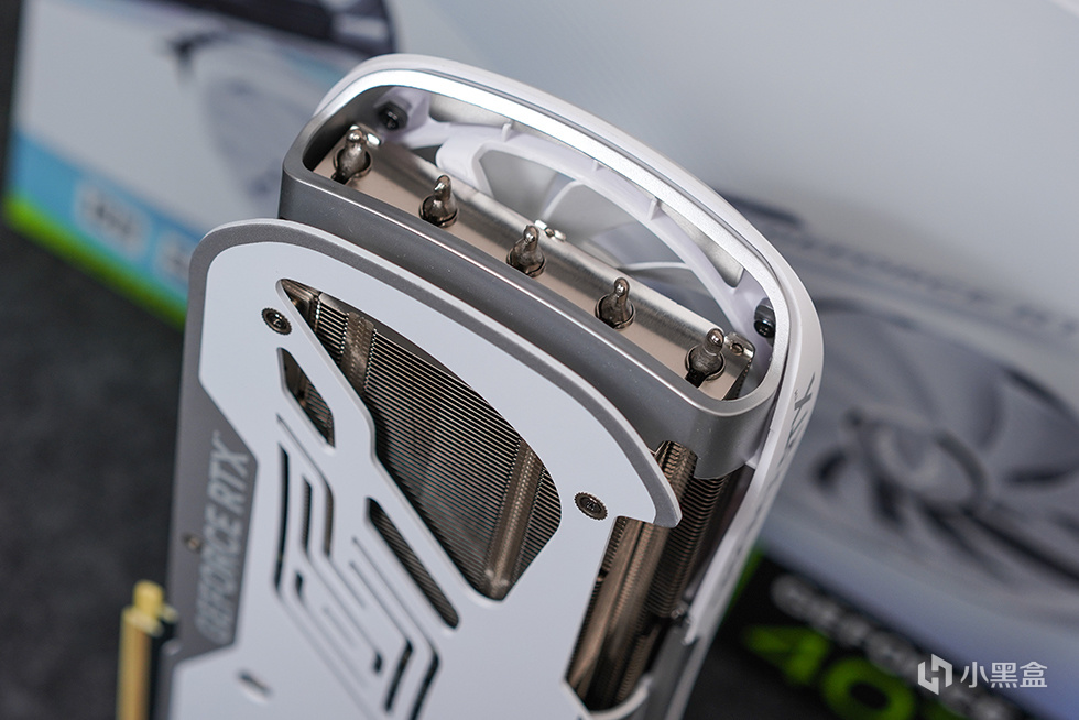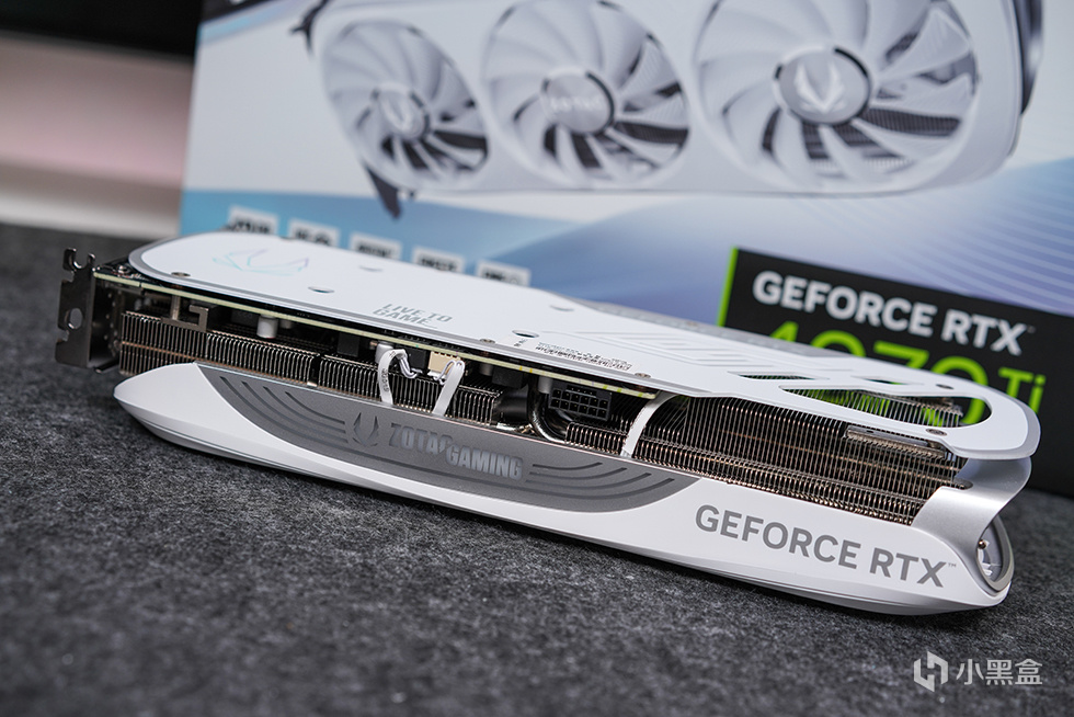 索泰RTX 4070 Ti TRINITY OC月白顯卡背部爲堅固的壓鑄金屬背板,並在末端有大面積鏤空設計,配合側面的鏤空露出的鰭片,能更快速的排出熱風,輔助顯卡散熱。