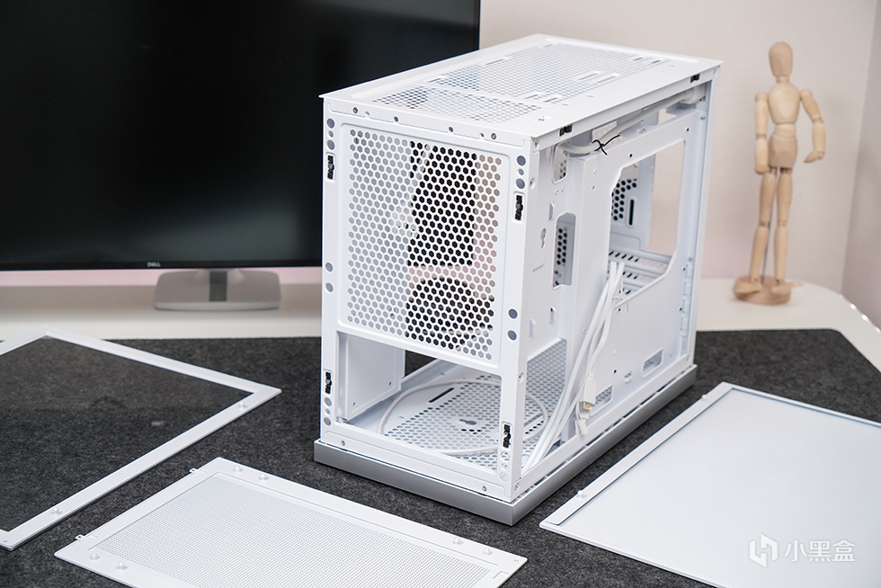 機箱正面的MESH網板,右側的鋼化玻璃面板和左側的SPCC金屬面板均使用無螺絲設計,輕鬆實現快拆,頂部帶有磁吸防塵網。