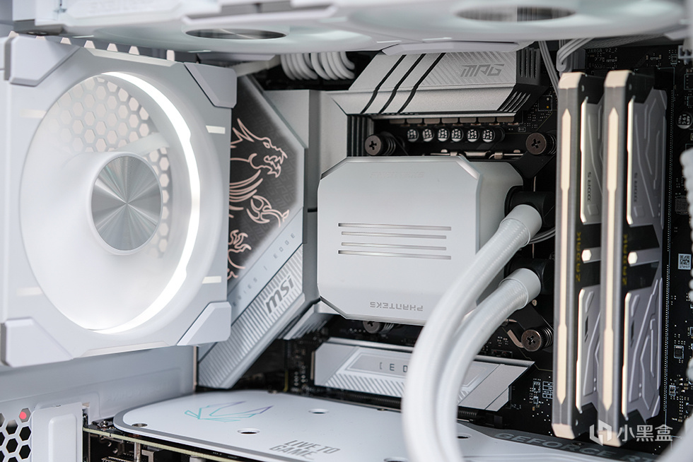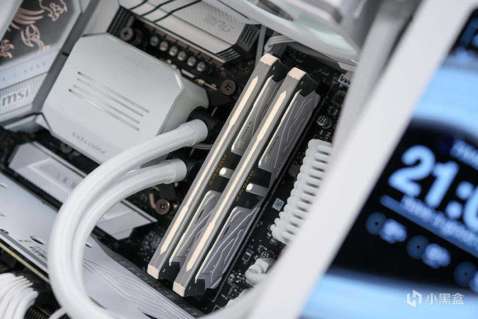 搭配RGB炫彩燈光和寶石設計風格的白色散熱馬甲,表面白色霧面磨砂工藝,頂部採用髮絲紋鋁合金裝飾條包裹,錯落疊加的設計呈現綴有寶石形狀的鏤空導光效果凸顯濃郁電競風格。