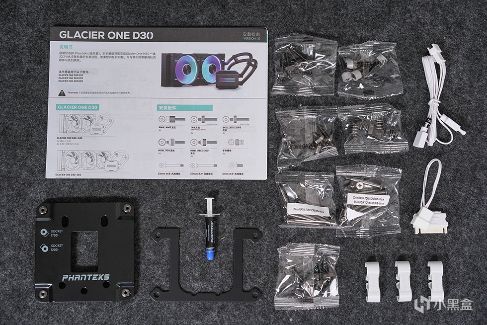 附件包含了全綵的說明書,INTEL和AMD的全平臺扣具,DRGB轉換線纜和供電線纜,3個理線卡扣,並附贈了一罐全新的硅脂用於替換使用。