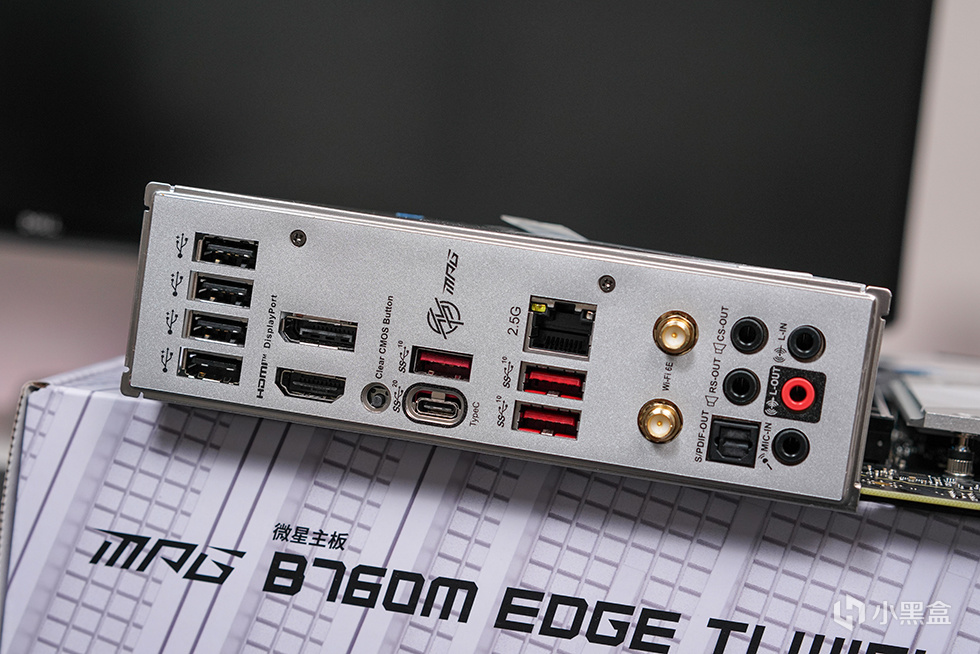 微星MPG B760M EDGE TI WIFI主板採用一體化背板設計,提供了1組4個USB2.0,1個HDMI 2.1顯示輸出接口、1個DP 1.4顯示輸出接口、Clear CMOS按鍵、3個USB 3.2 Gen 2 10Gbps Type-A(紅色)、1個USB 3.2 Gen 2x2 20Gbps Type-C、2.5G網絡接口、Wi-Fi / Bluetooth天線接口,以及音頻接口。