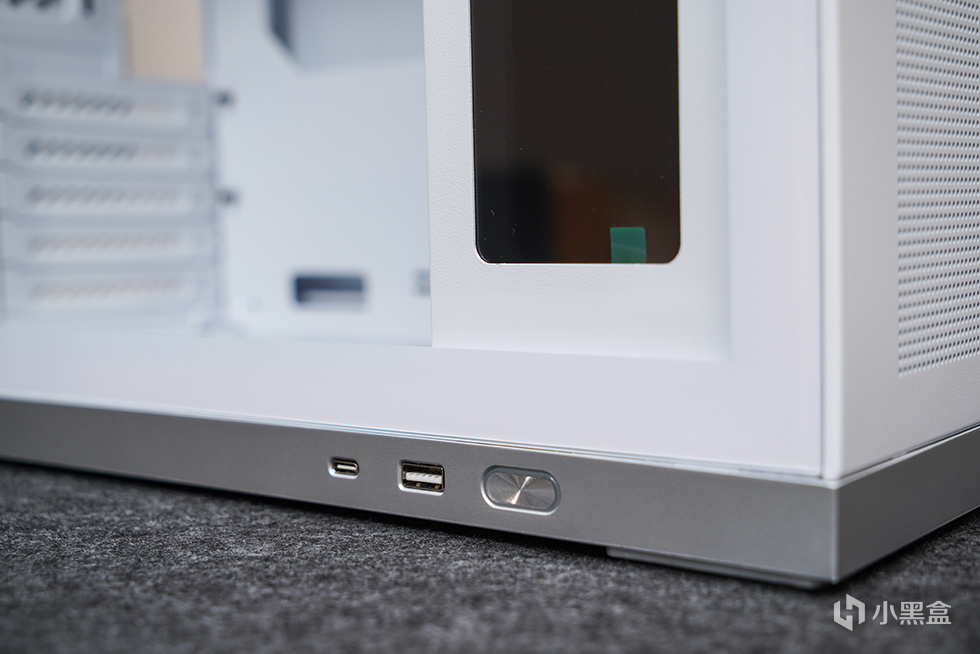機箱底部區域和主體做個色塊分割,IO面板以條形序列放置在了側面底部,視覺上十分協調。依次爲開機鍵(開機後按鈕有白色燈效),Type-C(10Gbps)和USB 3.0接口。