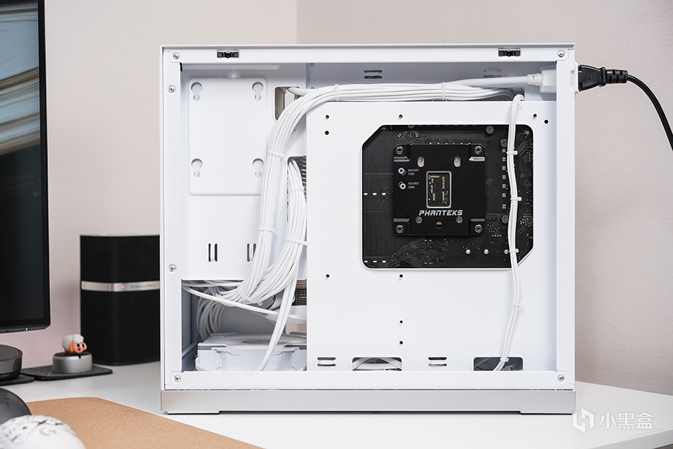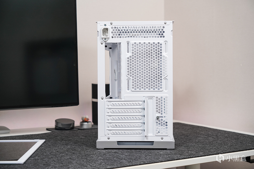 機箱的背面,主板區域採用大面積開放設計,更方便扣具的安裝。圍繞主板區域,設置了多處過線孔,左側內凹設計給予充足的離線空間,優化了理線過程。背部左側上方還提供了1個2.5寸硬盤安裝位。
