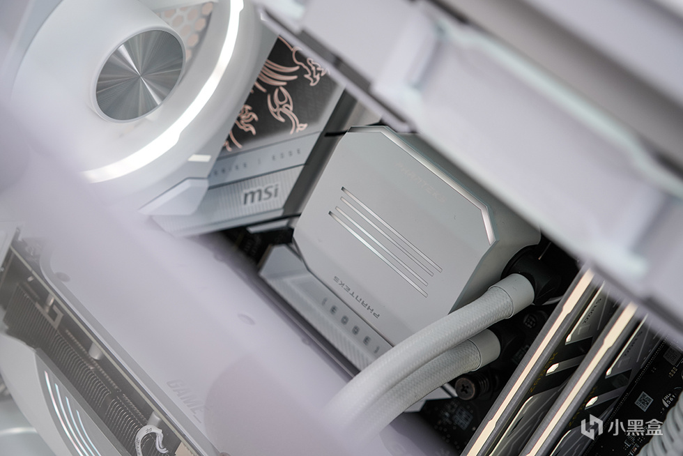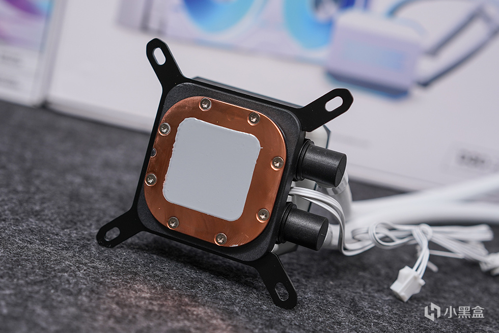 水泵內部搭載了3100RPM的高性能水泵和高耐久減震馬達,MTBF時間可達100000小時,純銅底座預塗了硅脂,進出水管的連接件支持方向調節,更便利冷頭的安裝。