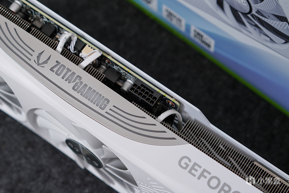 索泰RTX 4070 Ti TRINITY OC月白顯卡整體爲極簡流線風設計,正面順暢的線條紋路上,頂部的ARGB虹橋LOGO燈帶支持SPECTRA 2.0燈效系統,可以通過FIRESTORM管控軟件實現1600萬色調色及多種燈效模式調節,讓玩家隨心DIY。12VHPWR供電口就在虹橋上方,由12個供電針腳+4個信號針腳組成。