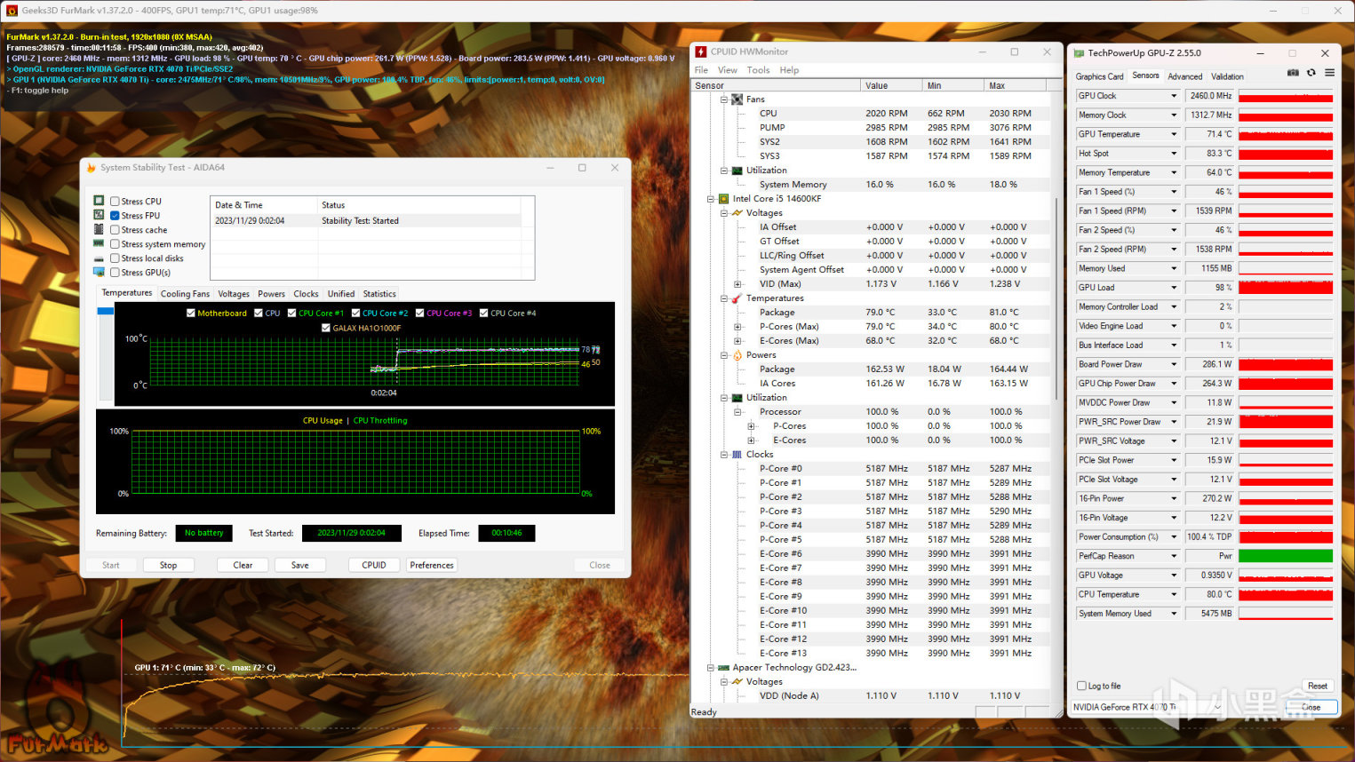 首先看一下雙烤的溫度,CPU功耗165W,最高溫度81℃,顯卡溫度71.4℃。