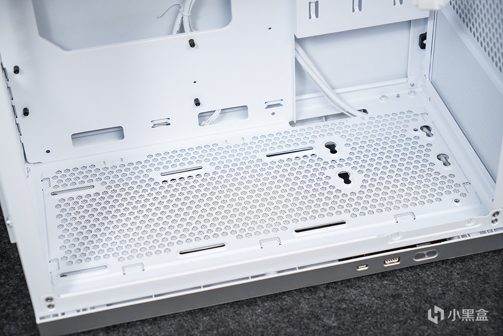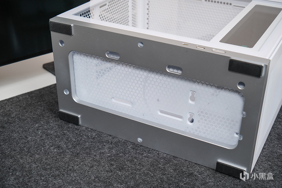 最後看一下機箱底部,一體成型的底部框架,預留了風扇螺絲的安裝開孔,同樣配置了防塵網,有效防止底部進風帶來灰塵。