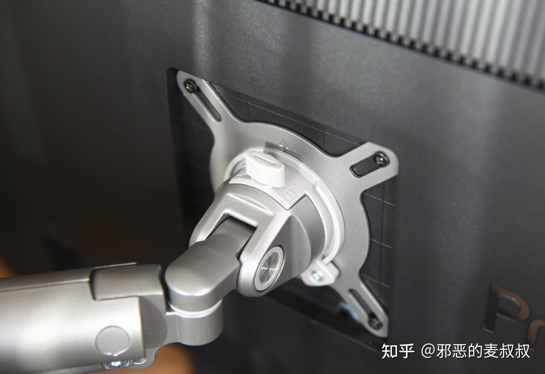 松能T7-1H采用的快拆式安装背板,把标准的VESA背板用螺丝固定在显示器背后,插入到支架臂顶部的卡槽中,并有旋钮可以一键锁定,通过快拆板可以轻松的安装和拆卸显示器,如果有多台显示器更换起来就很方便了。