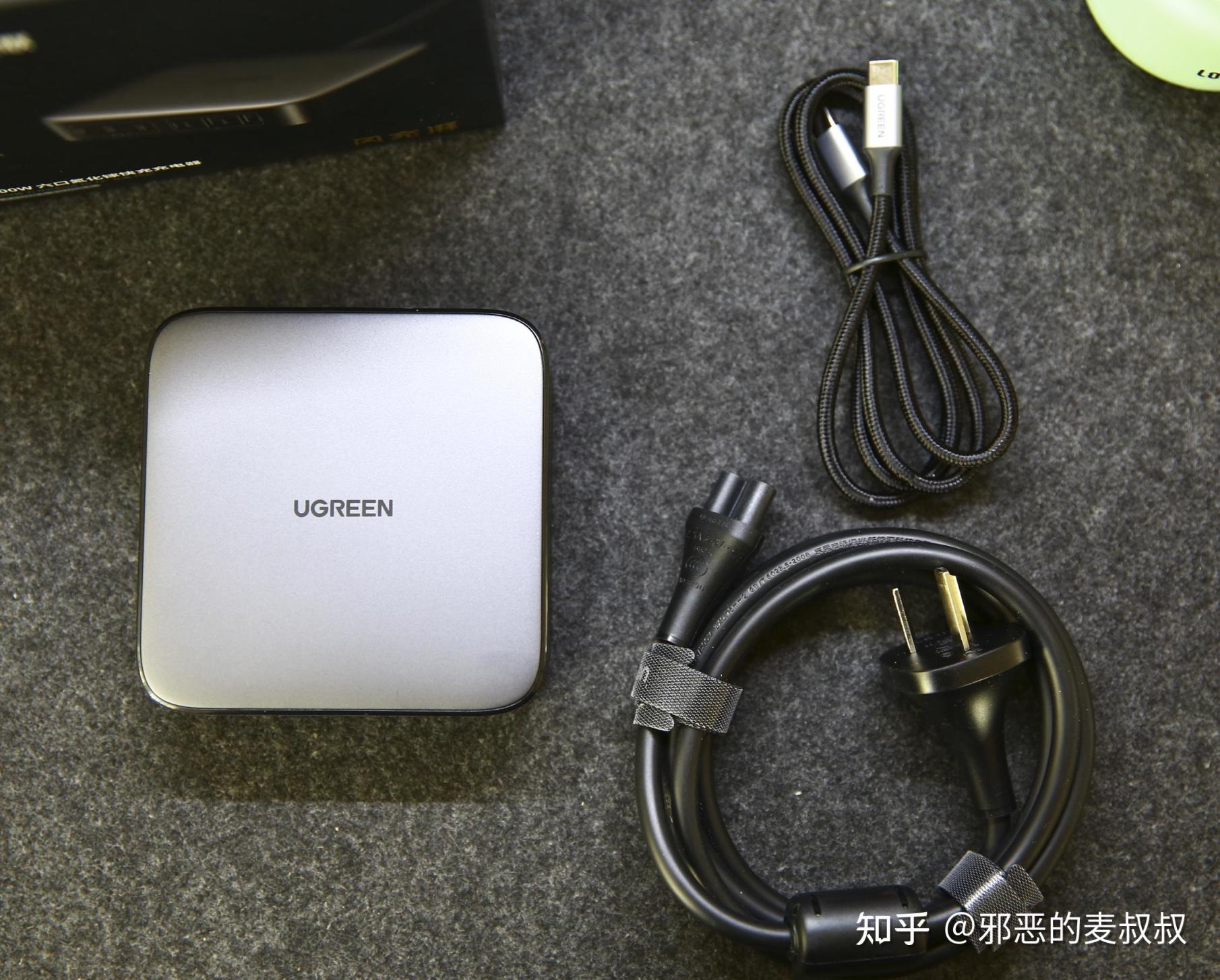 这款充电器在外观设计符合绿联一向沉稳高级的风格,表面是哑光金属喷涂的设计,即便是200W的高功率充电器,体积依然小巧,比传统硅充电器小三倍,很方便携带。除了原配的电源线之外,还赠送了一根支持100W传输的C口编织数据线。