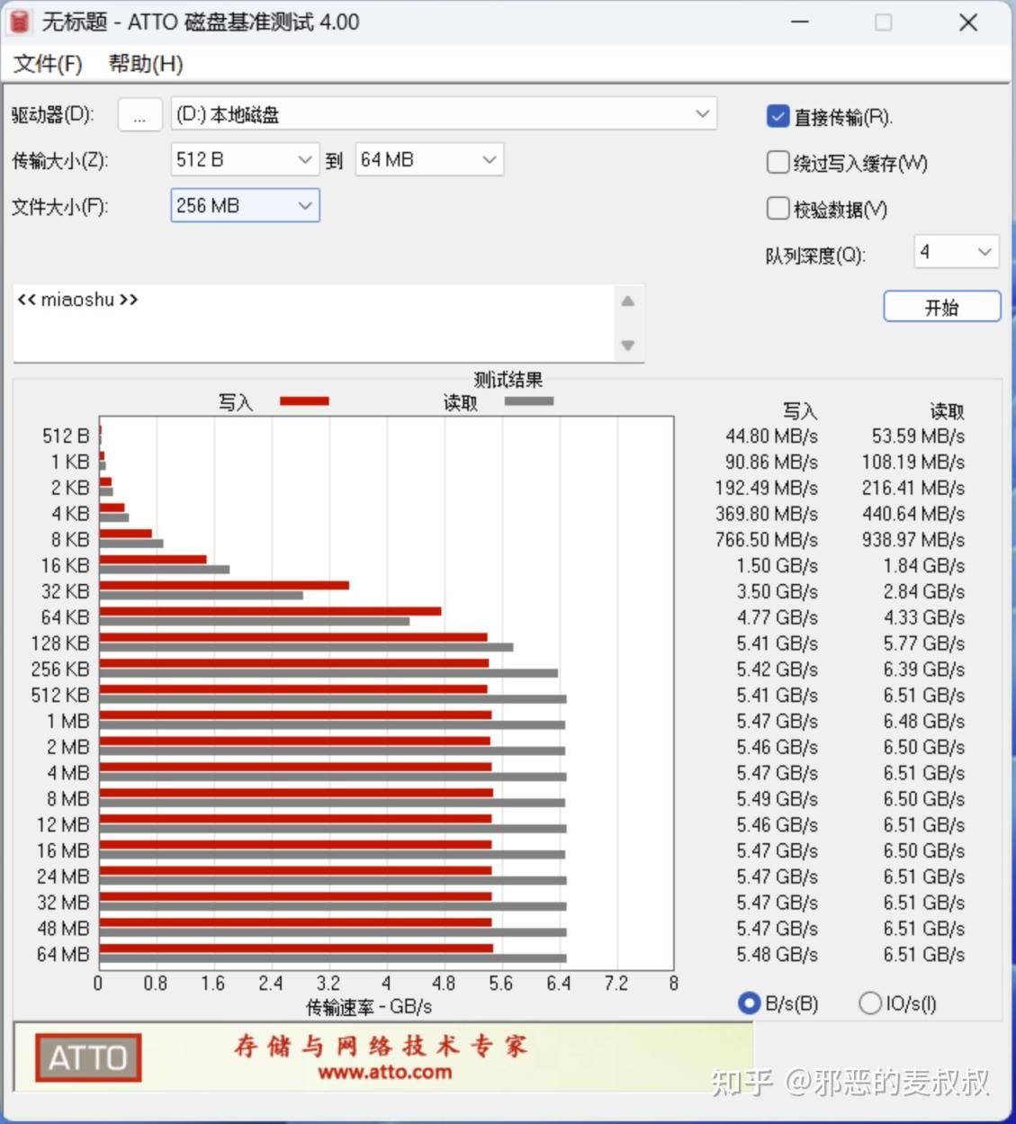 ATTODiskBenchmark是一款专门用来测试存储设备的读取及写入速率的软件,该软件使用了不同大小的数据测试包进行测试,测试完成后数据用柱状图的形式表达出来,ATTO Disk Benchmark测得希捷酷玩530固态硬盘对于1MB以上大小文件拥有非常一致的读写表现,最高写入速度5.48GB/s,最高读取速度6.51GB/s。