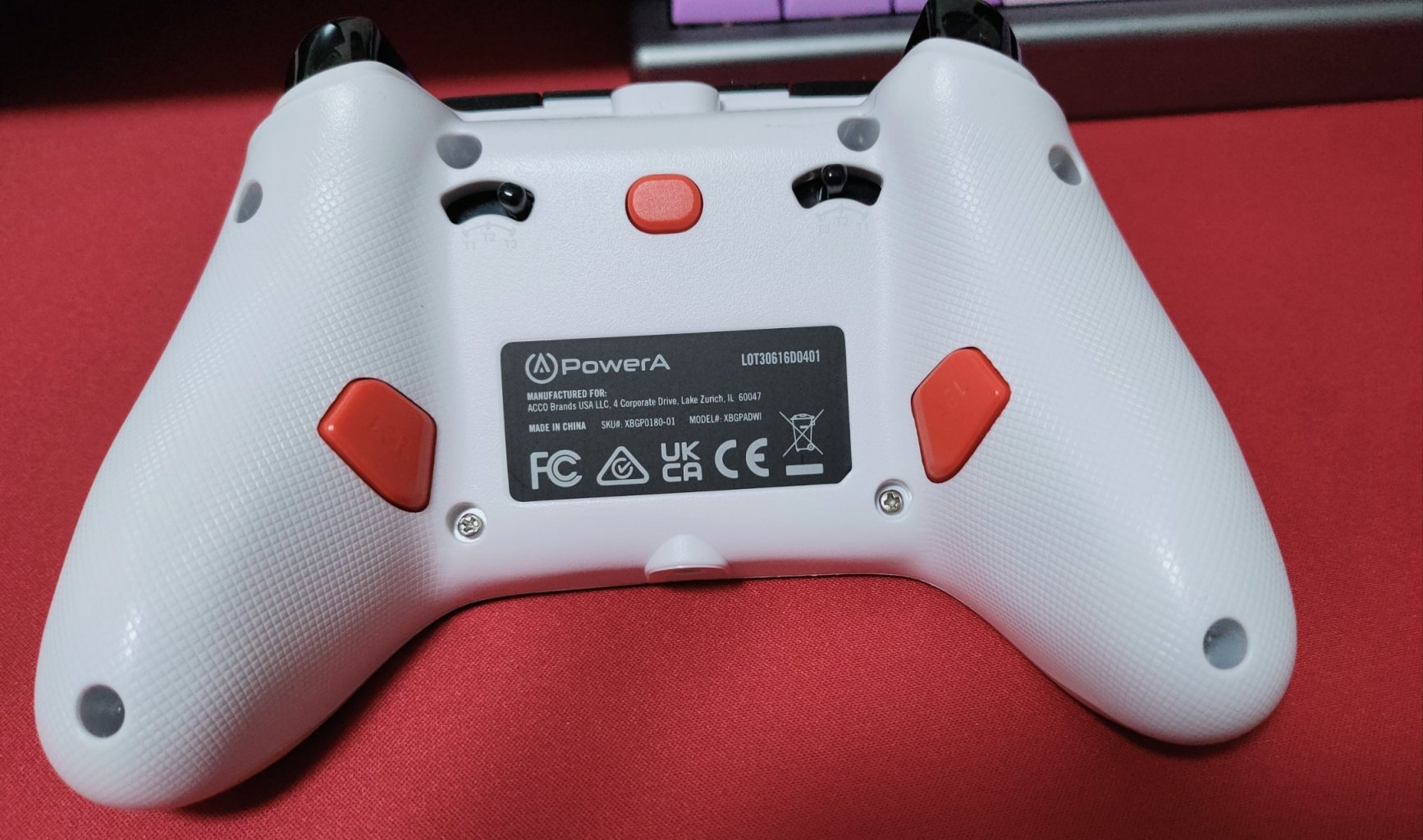 視線拉到手柄的背面,手柄後面擁有3個按鍵,上面的爲編程鍵,因爲微軟授權的問題呢,目前只能用來映射。下面兩側的爲兩個背鍵。
