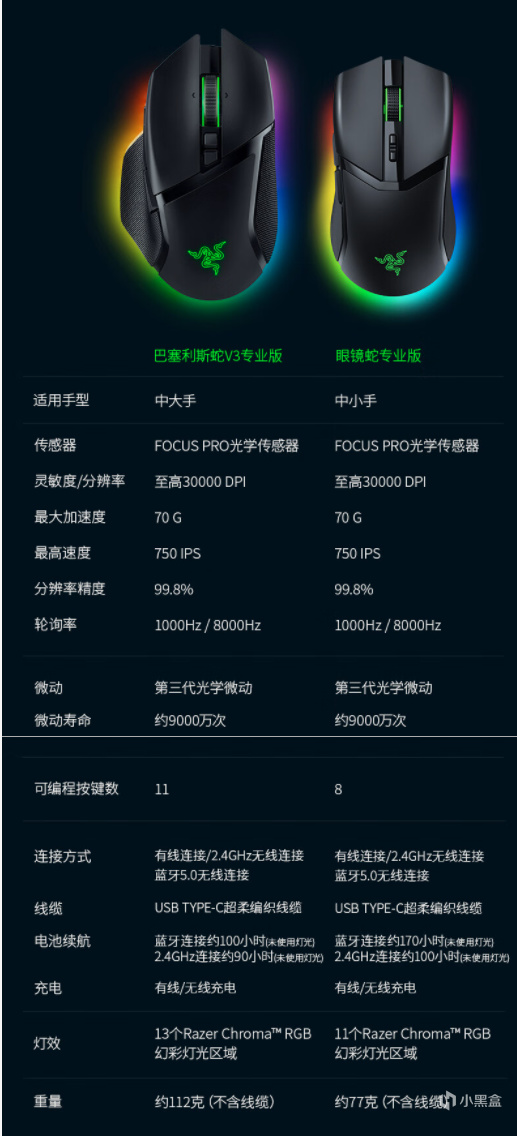 官方還貼心給到了巴蛇和眼鏡蛇的對比:更多是中大手和中小手以及重量和可編程按鍵的區別