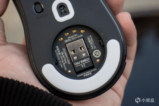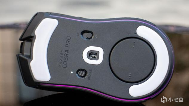底部是一圈兒U型燈帶,還有ProFile按鍵和三模切換,以及可以旋開的底蓋,裏面是接收器和充電觸點。