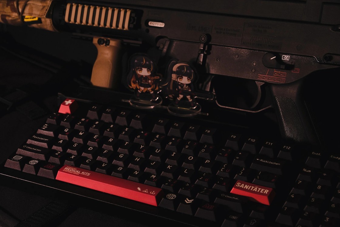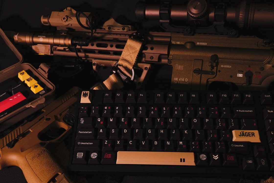 发想设计上,我的思路来源是知名德国枪械公司Heckler & Koch的旗下所有枪枝,包含了MP5、HK416、UMP45、G36等等名枪。一样秉持以前的“概念系”的理念,本体上会出现的刻字、图案等等会尽可能的用个性键帽的方式展现。