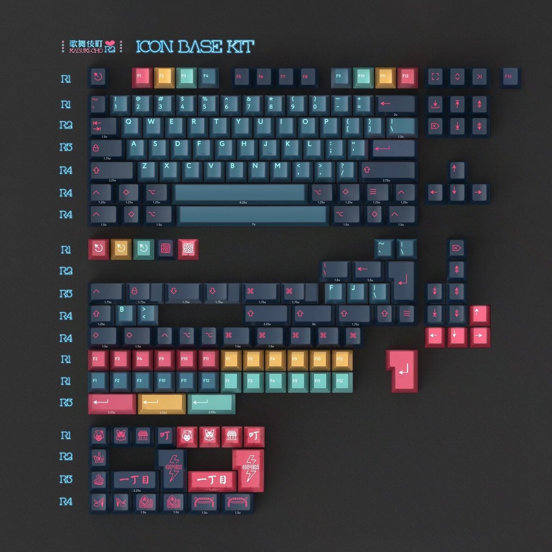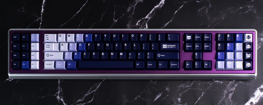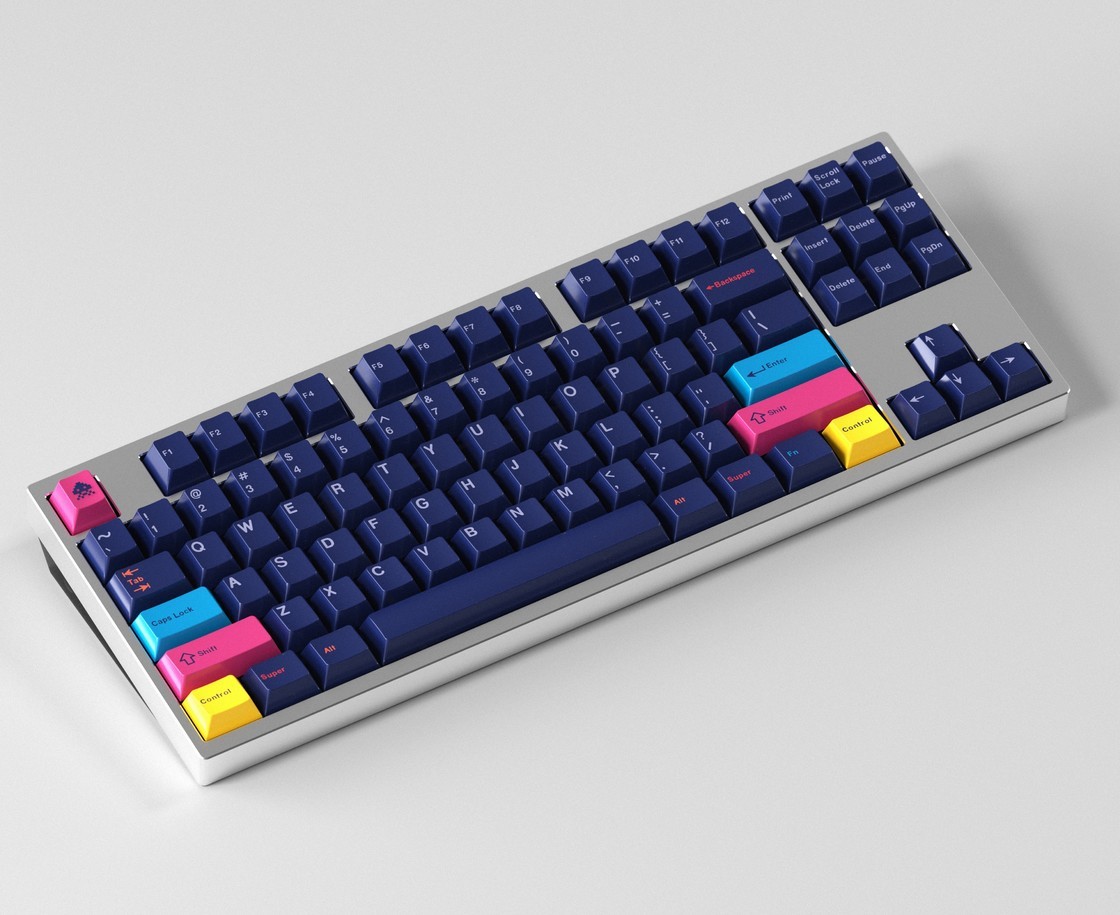 深蓝色背景带有怀旧、神秘的氛围和浅灰色字体为整体设计提供了平衡感,橙黄、粉红、蓝色和深红的功能区配色则为键帽增加了一些活力和趣味性。