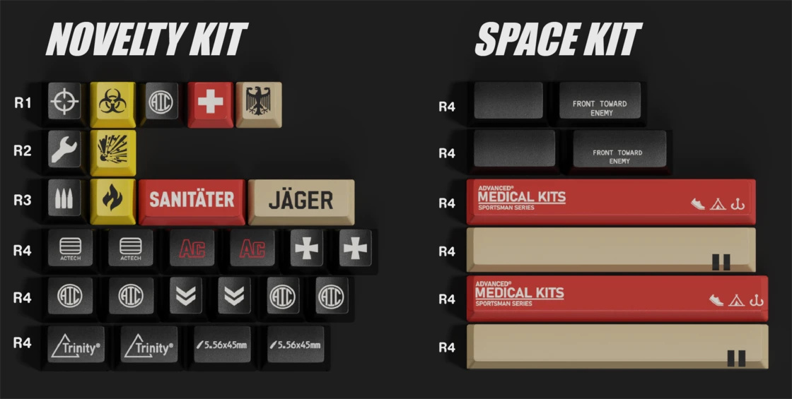 与经典的黑红俄文设计相比,这套战术设计在红色的运用上更加小心谨慎。沙色的运用可以模拟沙尘、沙漠等军事环境元素,用于点缀部分键区,增添主题感。黄色则用于警告、危险等元素,以强调特定区域。