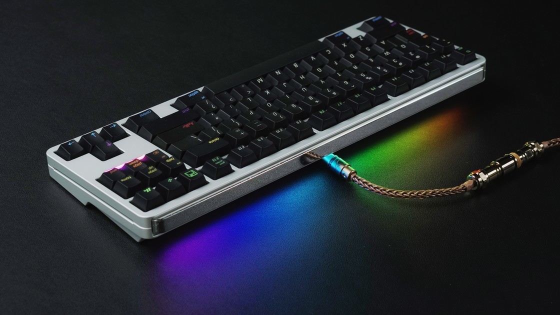 在灯光设计方面,与传统的RGB轴灯和近年来流行的氛围灯不同,Shadow-80%选择了一种「反射灯」思路,类似于拍摄时将灯光打在天花板上,利用反射光照亮产品的方法。铭牌处和C口上方分别设置了一条灯带,投射在键帽和桌面上形成柔和的流光溢彩效果,整体灯效相对收敛。