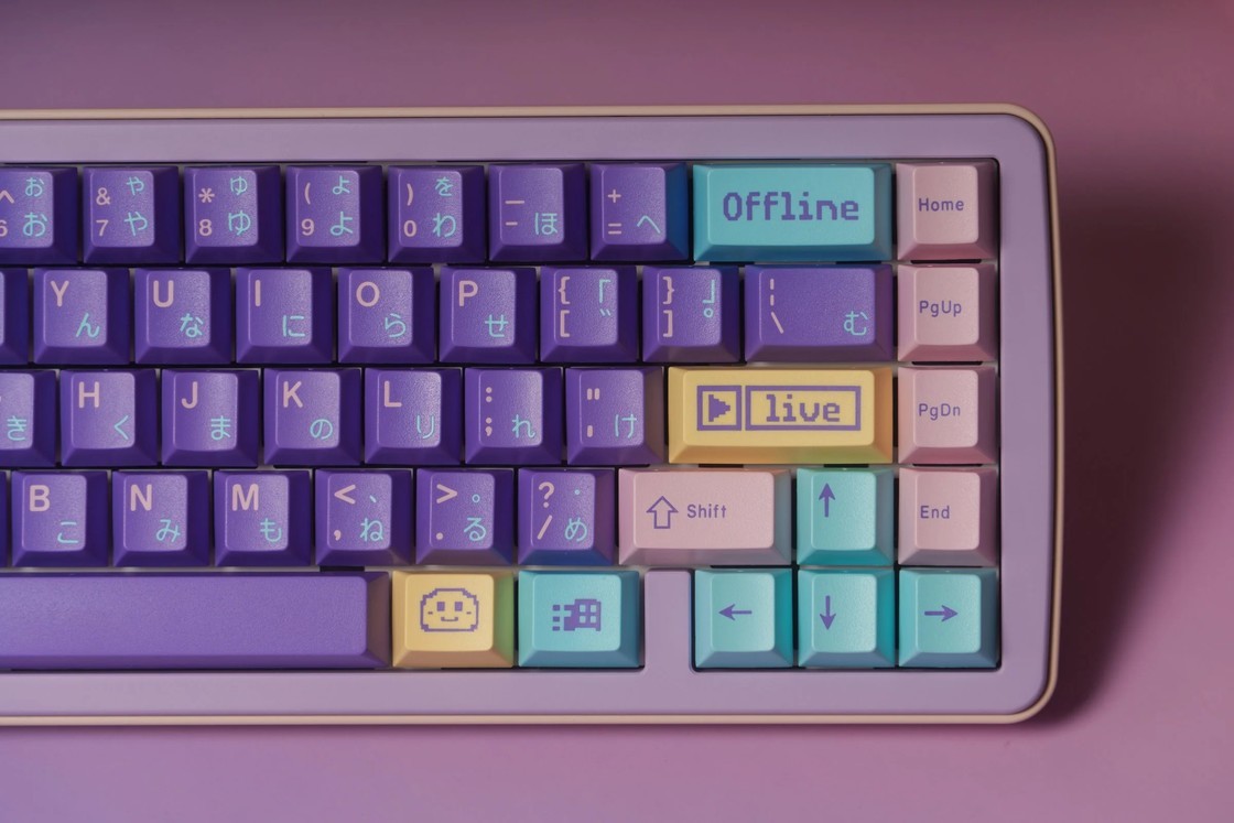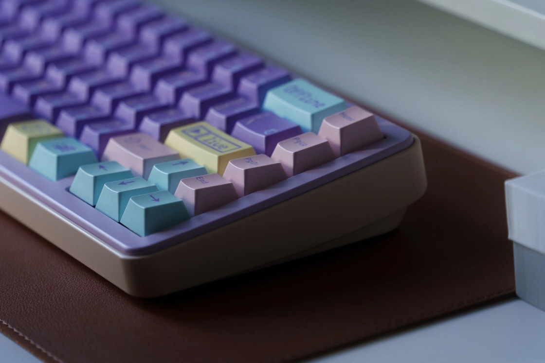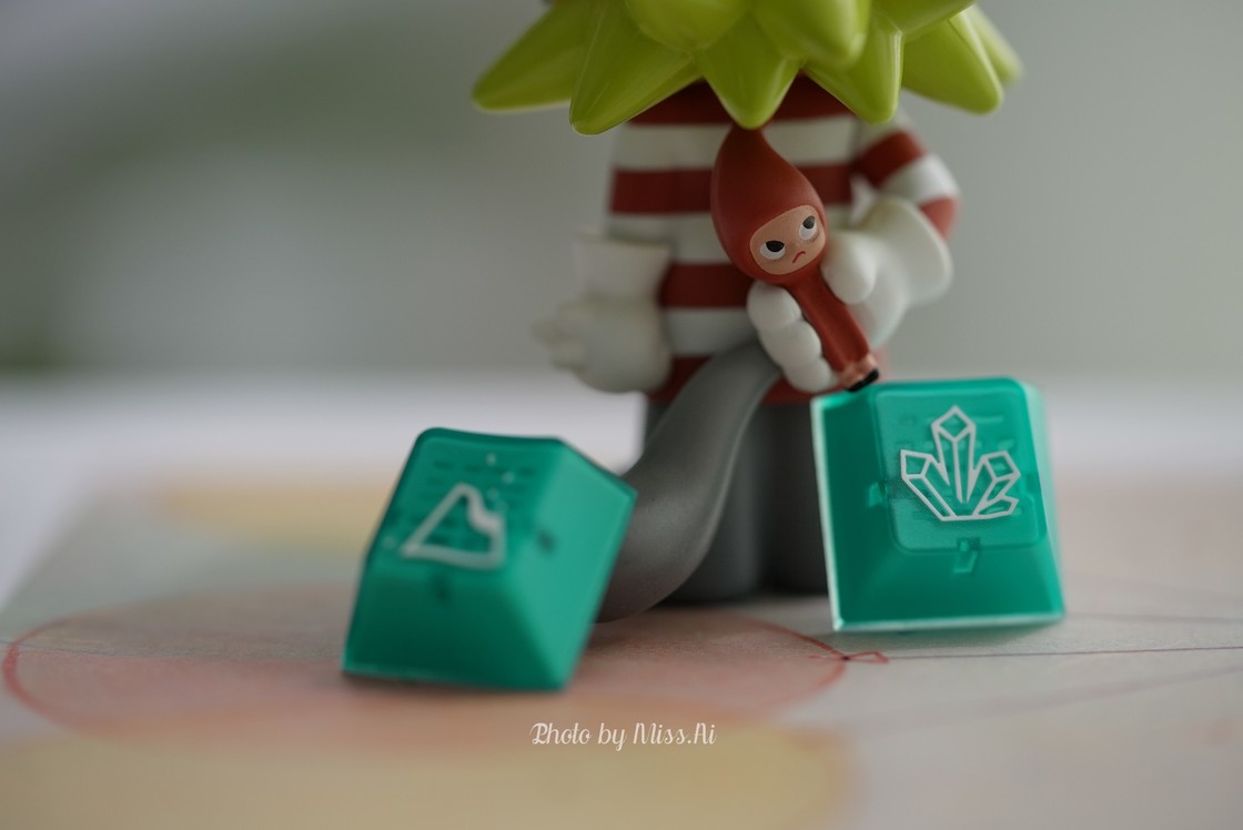 配色方面我很喜欢,相较于现在很多二次创作作品都喜欢直接从角色身上取主题色调不同,这款键帽以紫色为主色调,搭配黄、绿点缀其中,没有那么腻口,个性设计对于边界感的把控也挺好的。