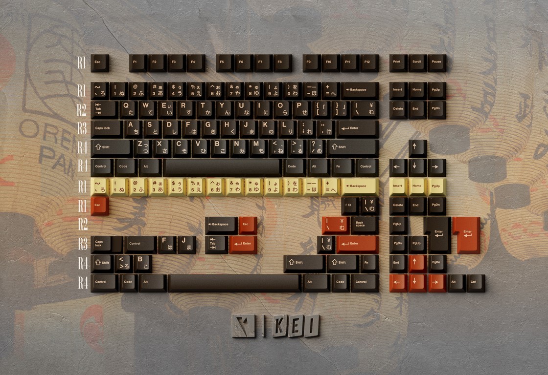 深沉的木色为整体设计提供了稳重感,而琥珀色和深红色的点缀则为键帽增添了一些活力和热情。初看这套键帽会让想起泰式奶茶和mcr的骑师,不过细看之下,二者之间还是有挺大的差异的,同时数字区的增补也增添了一些趣味。