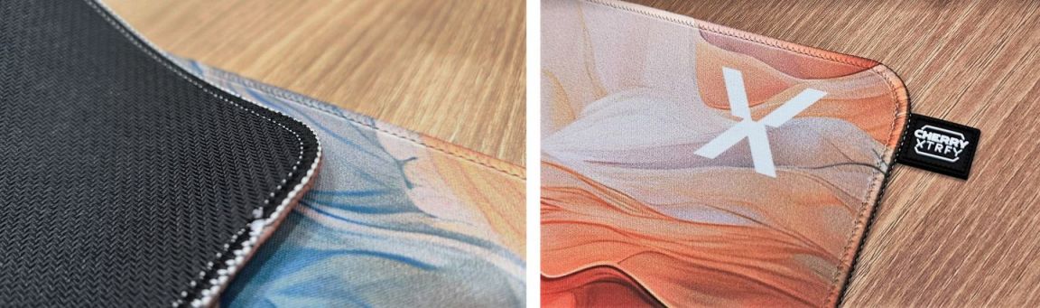 桌垫的底部是防滑的波浪纹,表面是细密的布面,并且边缘做了缝线包边,质量相当不错。右上角有一个 Cherry Xtrfy 的标志。