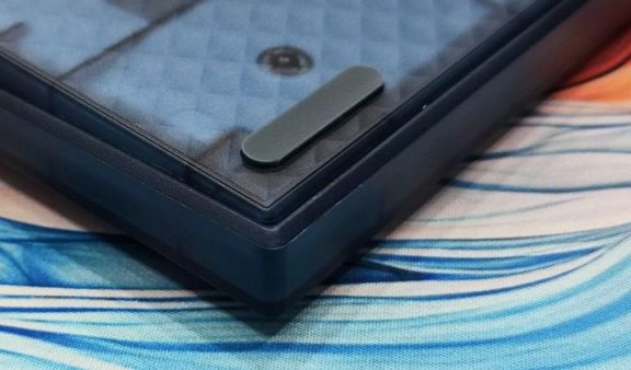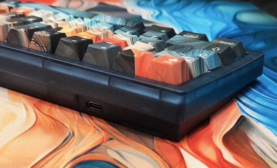 键盘在顶部有一个 Type-C 口用于有线连接。整个键盘外壳的外观是深蓝色的半透设计,RGB 灯光可以透出磨砂质感的漫射光,电竞氛围的灯效也有更好的效果。