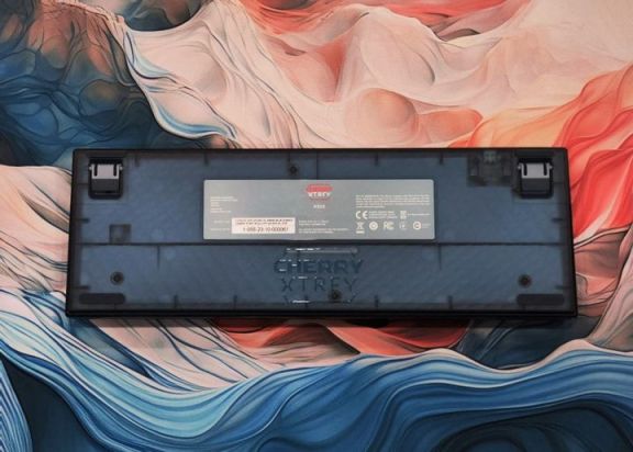 底部表面有斜向的方格纹路,正中央区域有产品信息的贴纸,以及一个轻微凸起篆刻的 Cherry Xtrfy 标志。
