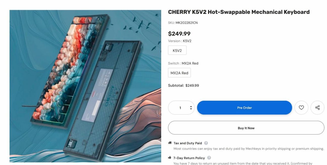 这把首次搭载樱桃键盘 MX2A 新红轴轴体的CHERRY XTRFY K5V2 洪流,目前2023年10月底首发优惠价是 1099 元,日常价为 1299 元,国内价格比海外发售的价格更低一些。