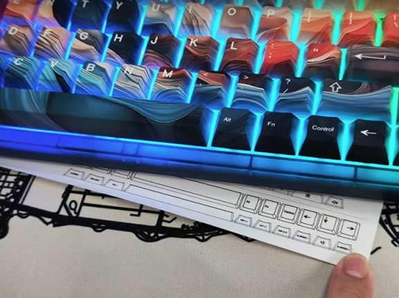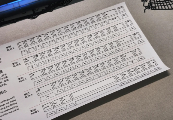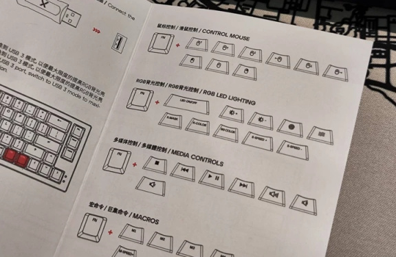 由于这把键盘的键帽做了高颜值的色彩洪流设计,所以 Fn 层的按键是没有直接在键盘侧刻位置上的。在刚开始用的时候,想要找一些多功能按键,会参考到里面给的一个说明手册纸。