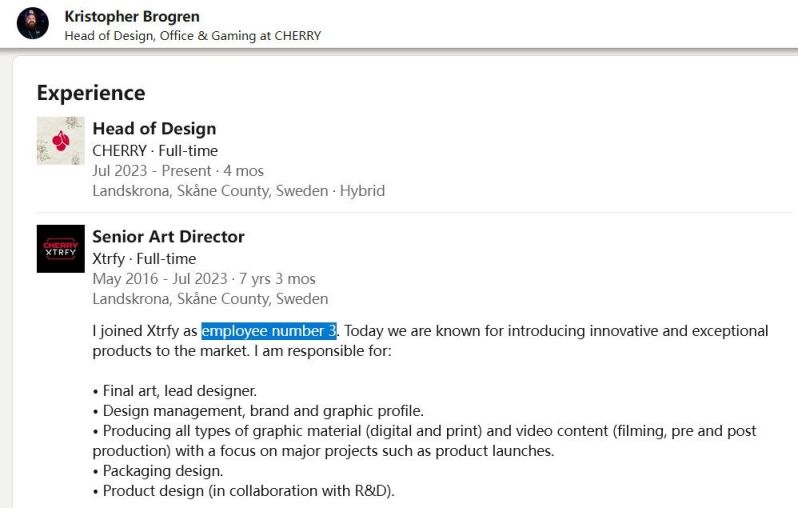设计来自于目前Cherry首席设计师,瑞典艺术家 Kristopher Brogren。这位设计师是 7 年多前 Xtrfy 初创时代的 3 号员工,也是深耕了多年。