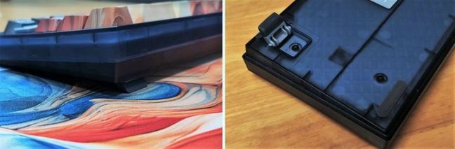 键盘的底部有四个脚垫,单段式的脚撑,可以抬起一定的角度。