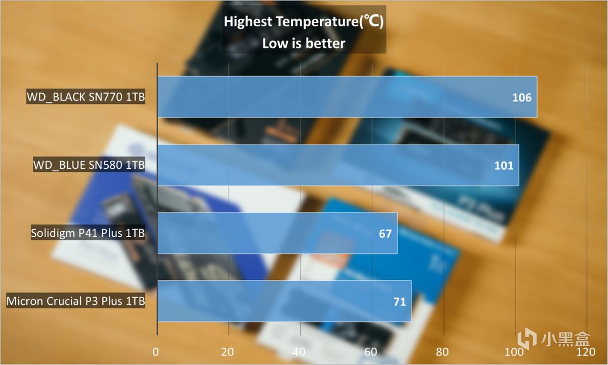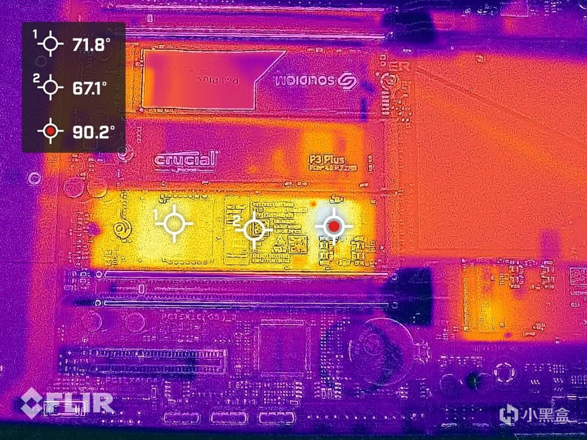 另外我们也通过HWiNFO64 v7.62-5200抓取传感器温度作为参考,结论与红外线检测相当,温度最低的是Solidigm P41 Plus,其次是Micron Crucial P3 Plus,WD的两款产品在裸盘的状态下温度很快超过了100℃。