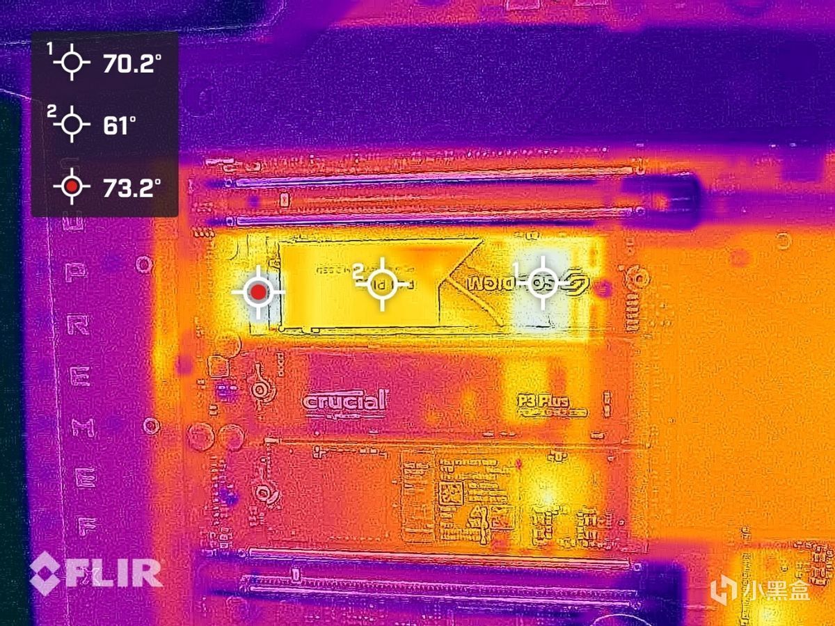 Solidigm P41 Plus的主控Silicon Motion SM2269XT最高温度为73.2℃左右,颗粒温度70.2℃。