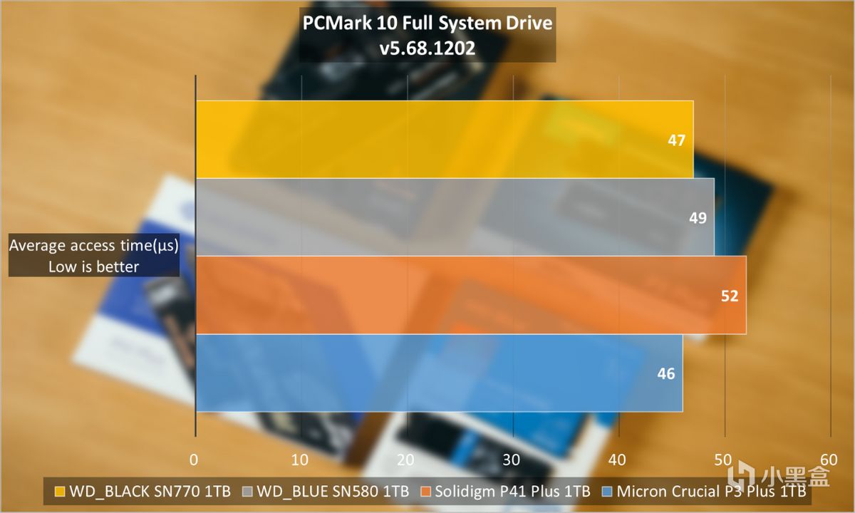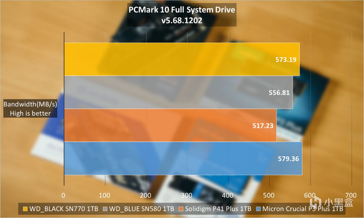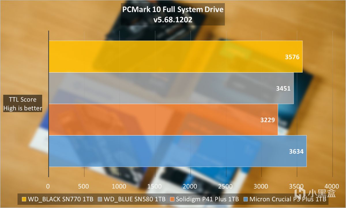 现在让我们进入游戏、系统等更为综合的环节。PCMark 10 Full System Drive是考虑较为全面且复杂的综合测试,这里看到Crucial P3 Plus与WD_BLACK SN770表现相当,Crucial P3 Plus更胜一筹。