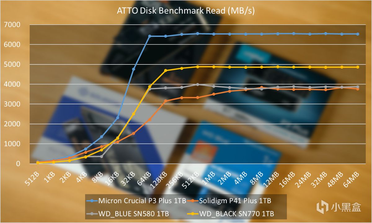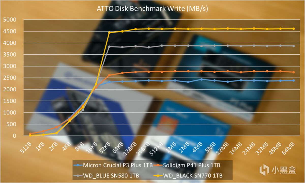 ATTO Disk Benchmark通过模拟不同大小的数据传输来测量磁盘的读写速度,考量不同文件体积下各家固态硬盘的传输表现。这里的写入与读取成了两个鲜明的对比,在写入测试中,WD_BLACK SN770表现更为突出,其次是SN550,但在写入中,Crucial P3 Plus表现更明显,此次是WD_BLACK SN770、WD_BLUE SN580、Solidigm P41 Plus。
