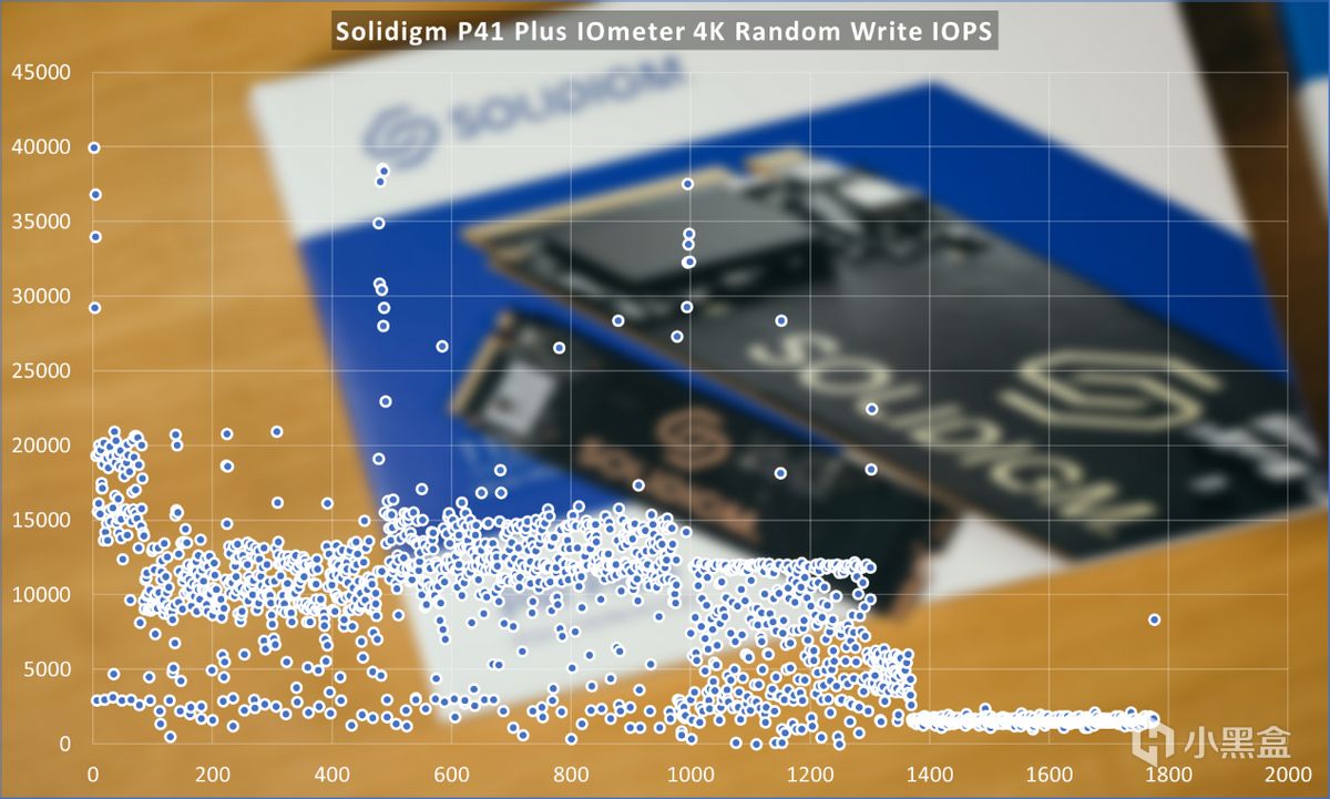 Solidigm P41 Plus 1TB得益于动态缓存+静态缓存的双重策略,维持的时间比较长一些,达到23分钟左右,不过整体写入IOPS没有表现的非常迅猛,23分钟之后,Write IOPS下降到2K左右。