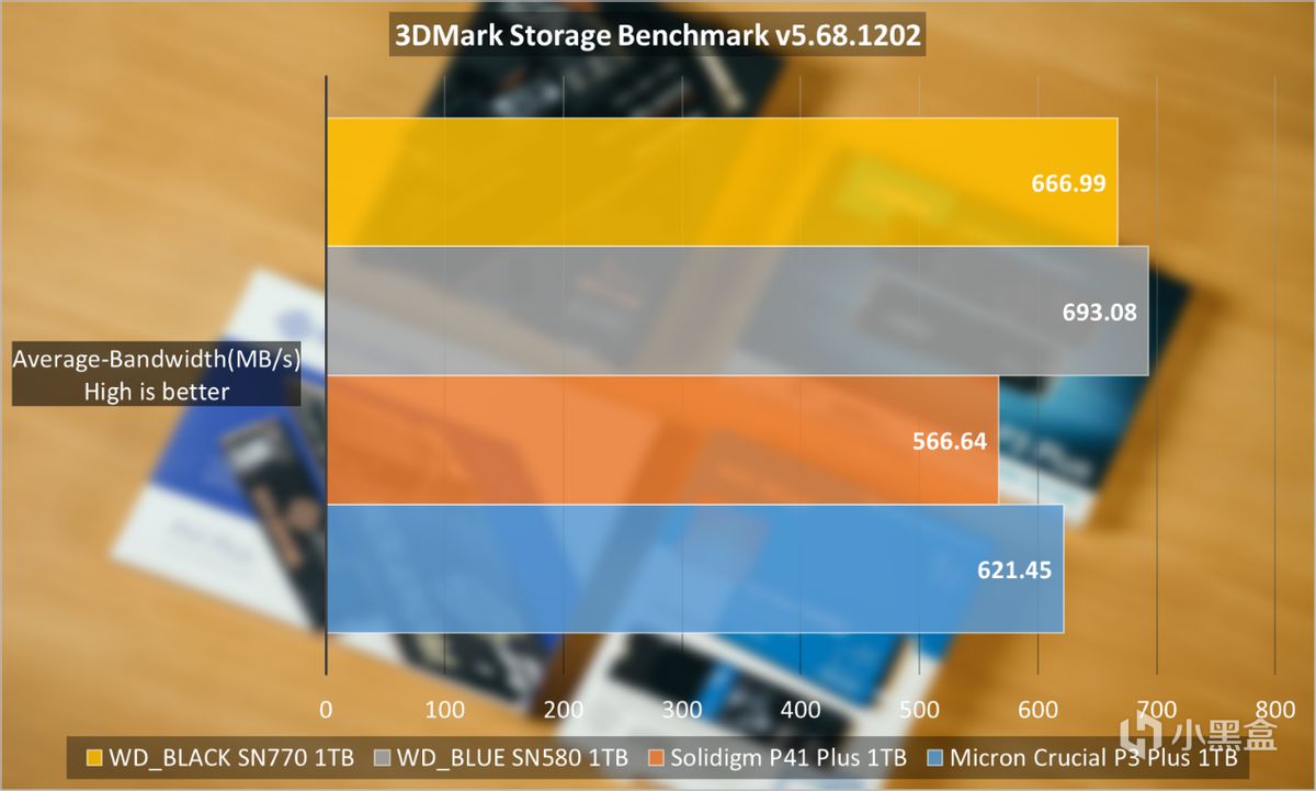 然后是3DMark的评分测试,这里WD_BLUE SN580表现更为突出一些,无论是响应时间还是平均带宽,都很符合WD_BLUE SN580对主流游戏的定位。