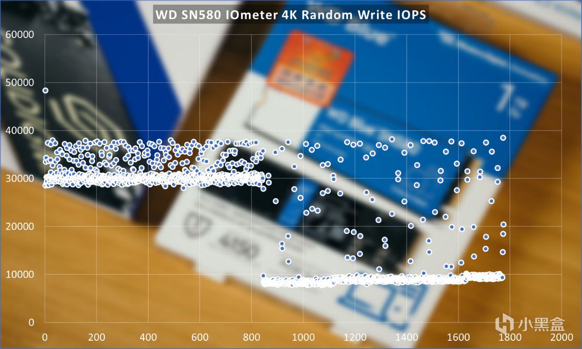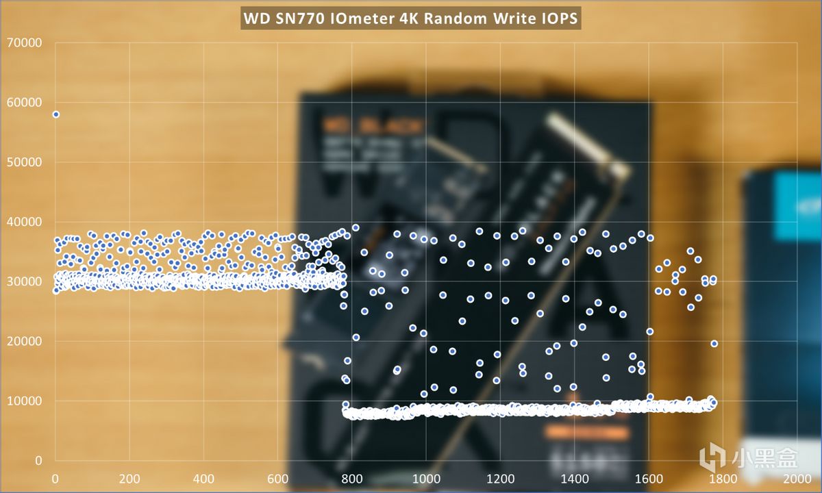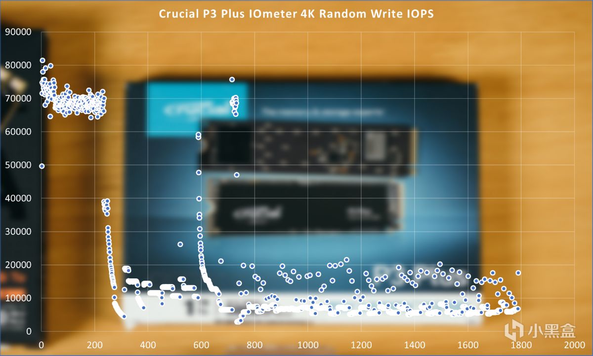 在测试中可以看到Crucial P3 Plus 1TB在维持大约3分钟以后,IOPS会下降至10K左右。