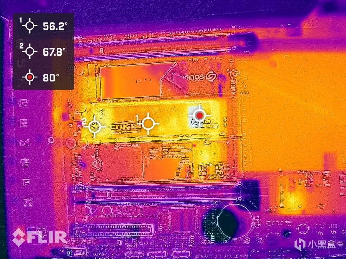 与此同时,我们也对四款产品在不带散热装甲的前提下,对全盘的发热表现进行了检测。在室温24℃的环境下,可以看到Micron Crucial P3 Plus在压力测试下,主控Phison PS5021-E21T温度来到80℃,存储颗粒温度大约在67.8℃左右。