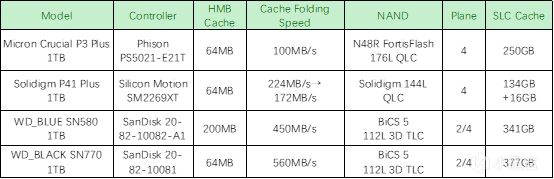 Crucial P3 Plus使用的是美光自家的Micron N48R FortisFlash,为176层QLC,同样也是4-plane设计,主控来自 Phison PS5021-E21T,HMB容量为64MB。在设定中,Crucial P3 Plus会给到250GB左右的SLC缓存来维持高速表现,不过缓外速度会降到100MB/s左右。