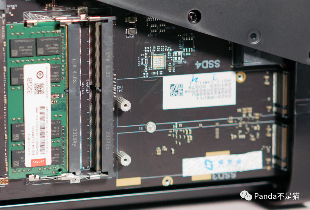 四个M.2插槽被分开放置,可能是怕四根M.2带来的热量不太好控制,所以把内存插槽设计在中间过渡。原装出厂为32G的内存条,看标贴的是联想的标签,后续进系统可以具体查查。