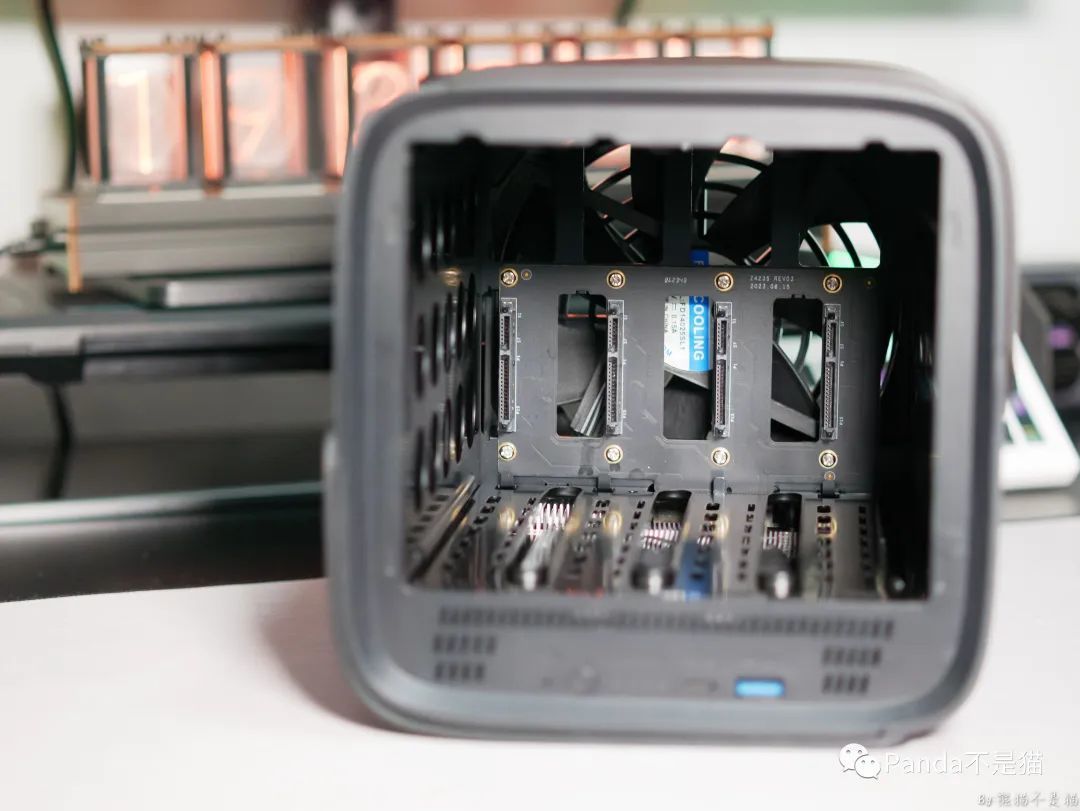 四个3.5寸机械硬盘位没什么好说的,咱们主要看内部的pcb。卸掉底部螺丝后按住金属部分往风扇方向推,即可拆下金属板,内存和固态硬盘都可以在这里进行更换添加。而另一边的挡板拆下后则是可以更换风扇,亦或者长时间使用后可以考虑给风扇清清灰。