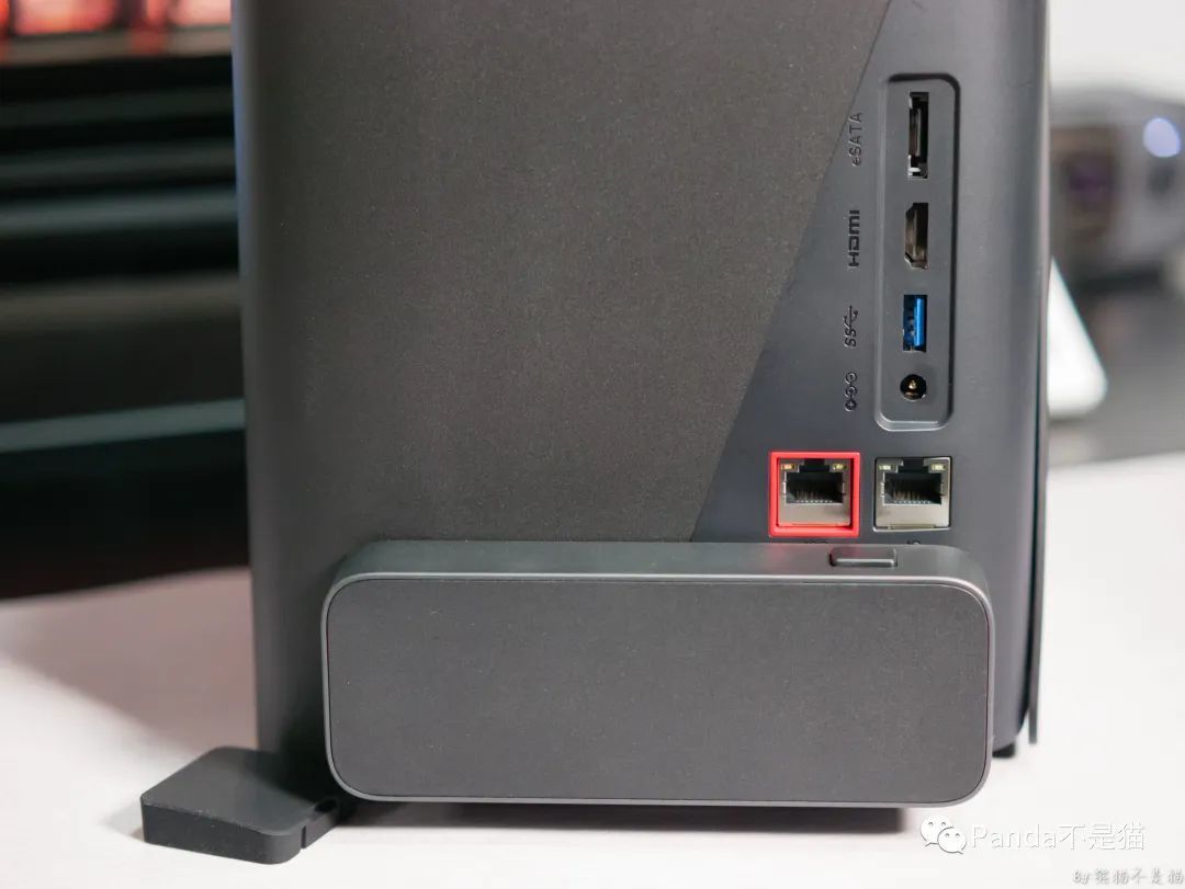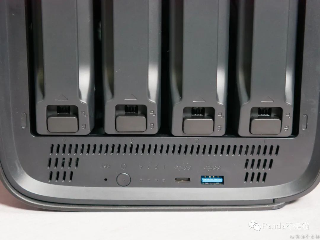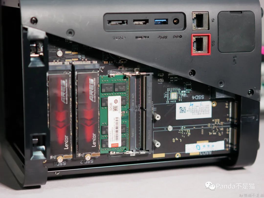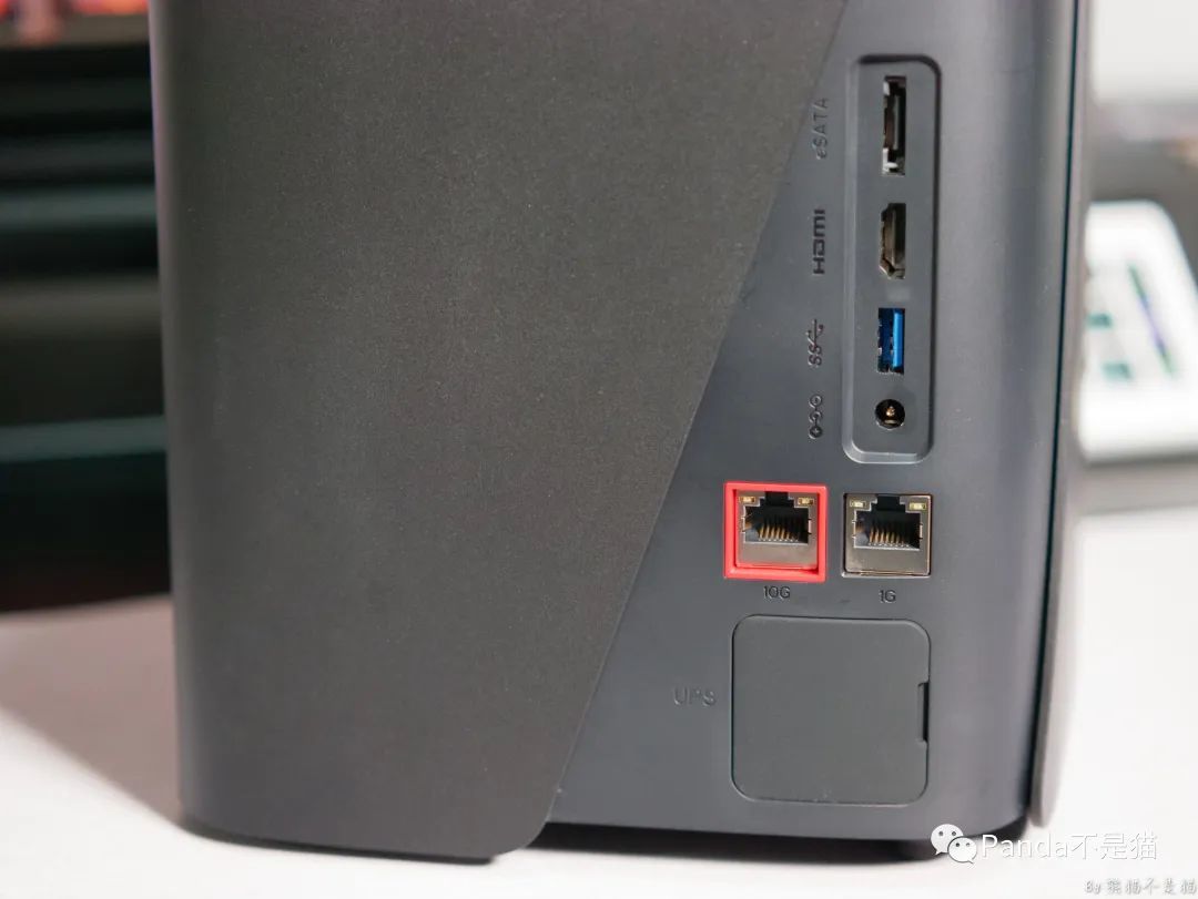 其他接口都被安排在了机身的背部,其中电源接口、eSATA接口、HDMI2.1接口、USB3.2Gen2以及一个万兆电口与千兆网口,专属的UPS接口也被放置在了这一堆接口的下面。接口的数量可能并不多,但涵盖了你需要用到的功能。HDMI支持HTPC模式,eSATA接口方便你外接硬盘柜,后置的A口甚至可以用于转接网口来实现三网口。