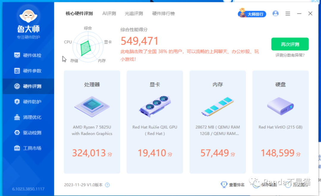 随后我又试了试鲁大师的跑分情况,综合得分54万,其中CPU得分32万。这个性能用来晚一些不怎么吃显卡的网友或者单机都绰绰有余了。比如梦幻西游的多开,玩玩三国杀等等都无压力。