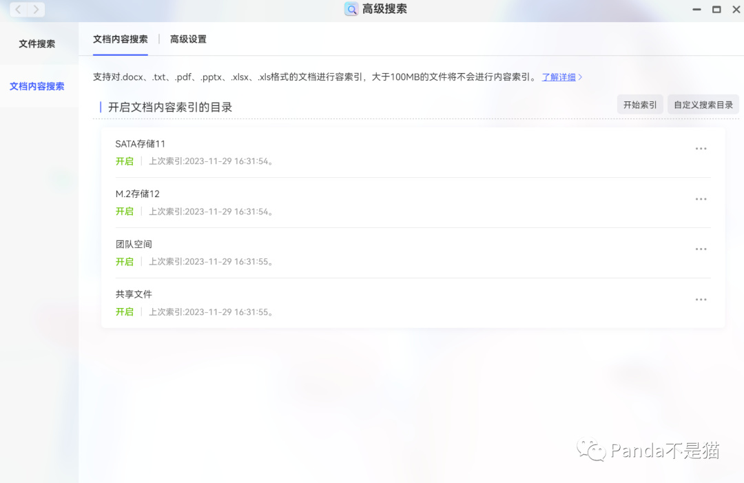 同时基于Z423的强大性能,高级搜索的速度也相对之前快了不少。索引时间也会比之前快上不少。通过高级搜索你可以快速定位你需要的文件或者文档中的内容,极大的节省了用户翻阅查找的时间。后续AI上线后,或许也能基于人像以及视频中人像的搜索,主打一个帮用户尽可能的高效使用NAS。