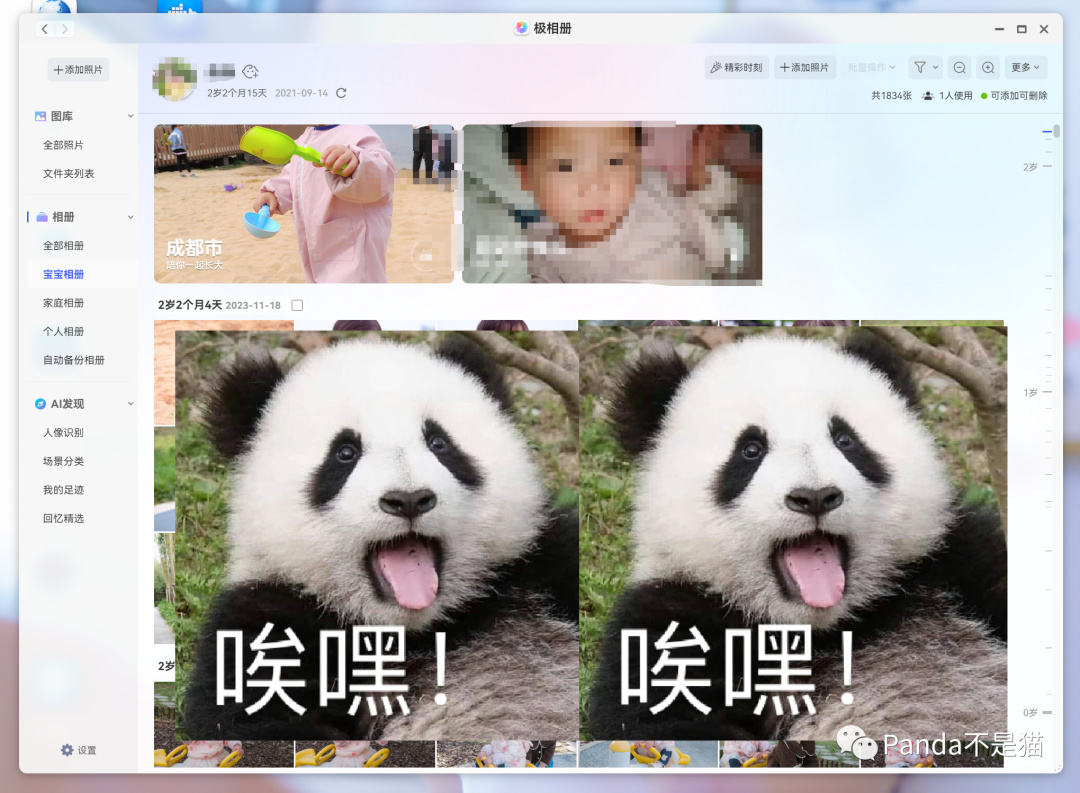 再来就是套件了,关于套件熊猫也说过很多次了,而极空间用户最为满意的也便是极空间这一套自研的套件。极相册算是我用的最多的套件,相较于传统NAS的不便捷,极空间在相册UI以及个性功能上都做到了符合我们国人使用习惯,也增加了一些特色功能,例如宝宝相册,人物关系定义等这些内容。