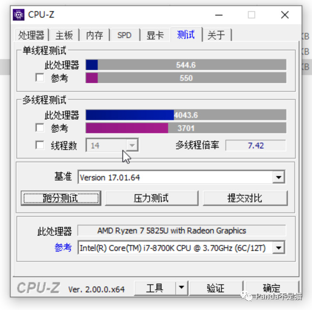 首先是cpu-z的测试。单线程分数来到了540左右,而多线程则是来到了4000的分数,对比I7 8700K也是略胜一筹,毕竟这是在限制下的跑分情况,不限制应该更高才对。