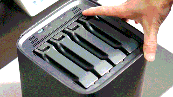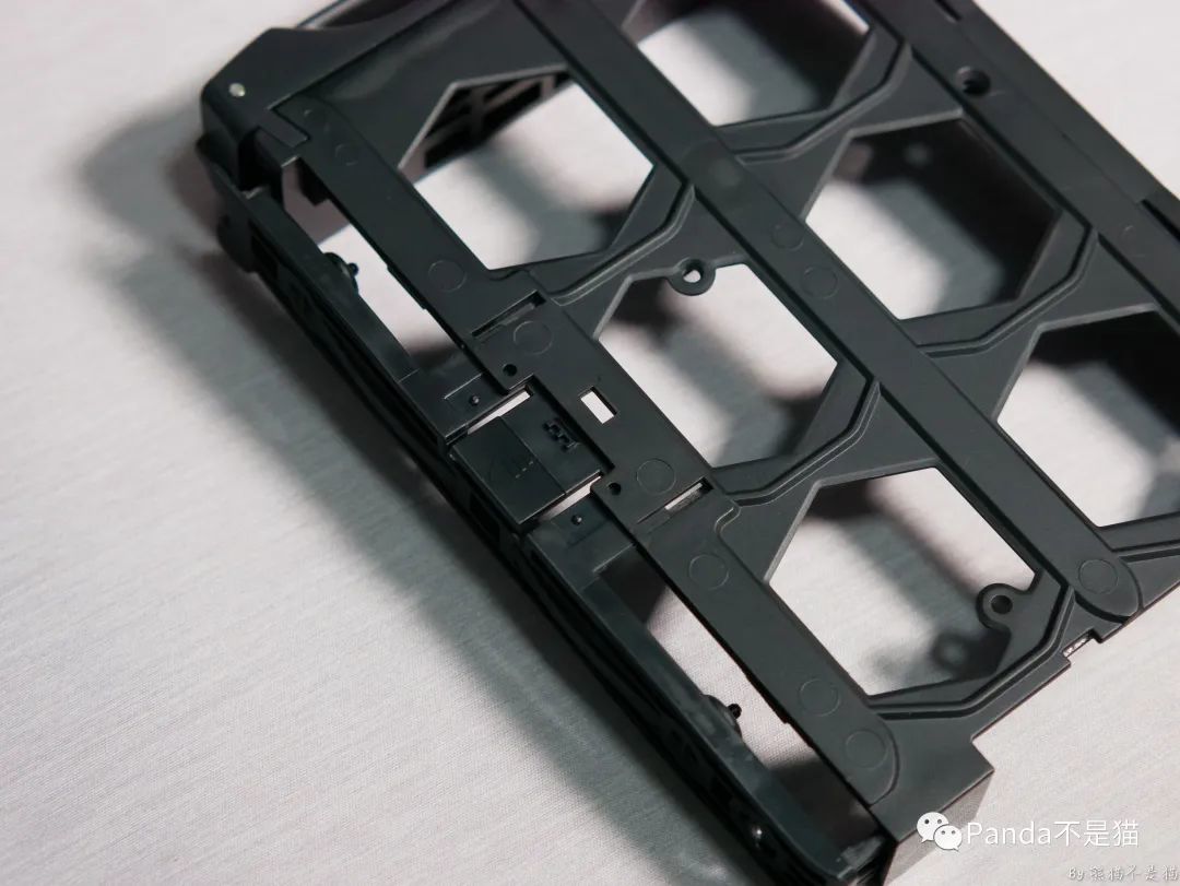 因为是竖置,所以在硬盘位于硬盘架上,极空间也为Z423做了全新的设计。通过卡扣式的开关来释放硬盘架就可以实现硬盘架的取出与锁定了。操作上更方便,卡扣的回弹也做的蛮不错,不管是开还是关,内部的弹簧都会稍微给一点力让你知晓当前状态。