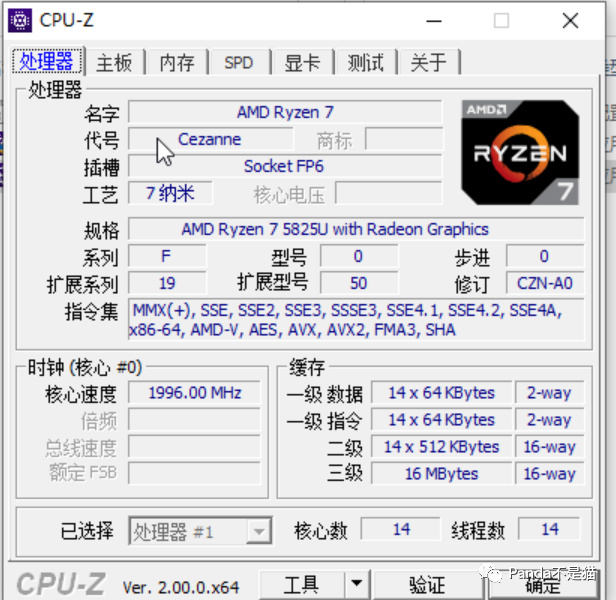 测试系统选用的为win10,毕竟目前大家大部分电脑采用的也基本为win10的系统。先看看CPU的参数情况,识别显示为14线程,也是因为创建虚拟机带来的限制。这颗芯片在桌面端很少见,采用的7纳米的工艺。