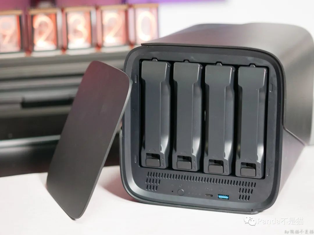 Z423在结构上采用了竖置结构,这对于喜欢把NAS放在台面上的人来说很友好。竖置一个能节约更多的桌面空间,再一个会更加的美观。同时,将硬盘位放在上面也更为方便硬盘的插拔,加上磁吸盖的设计,个人感觉比传统的横置进灰量要小一些。同时竖着放为了避免硬盘触底震动等原因导致的硬盘损耗,极空间Z423在机身内部做了双层硅胶悬浮减震,避免硬盘与机身的直接接触,通过软连接保护硬盘,也极大的降低噪音。