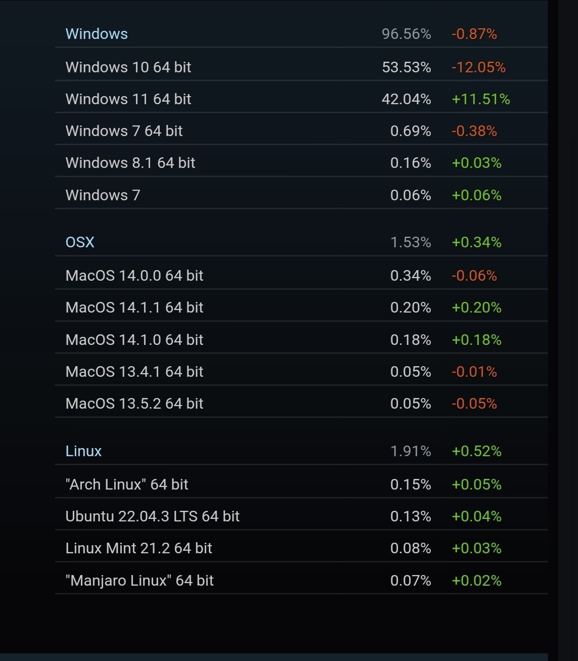 12月2日,Steam公佈了 11 月最新的軟硬件調查報告,“Steam 硬件和軟件調查: November 2023”。